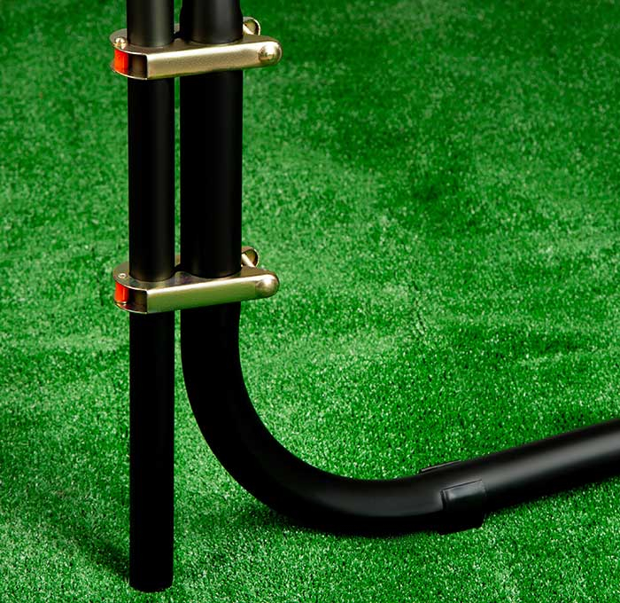 Т-образная конструкция стоек для фиксация сетки обеспечивает ее максимальное натяжение, без провисаний. Тем самым достигается максимальная безопасность при эксплуатации.